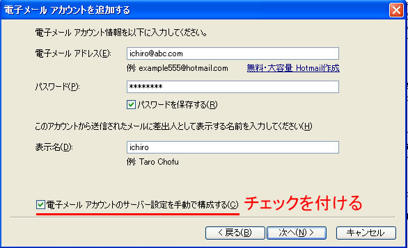 ※「電子メールアドレスのサーバー設定を手動で構成する(C)」にチェックを付けます。
