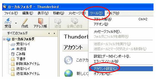 ①メニューバーの「ツール」をクリックし、「アカウント」をクリックします。